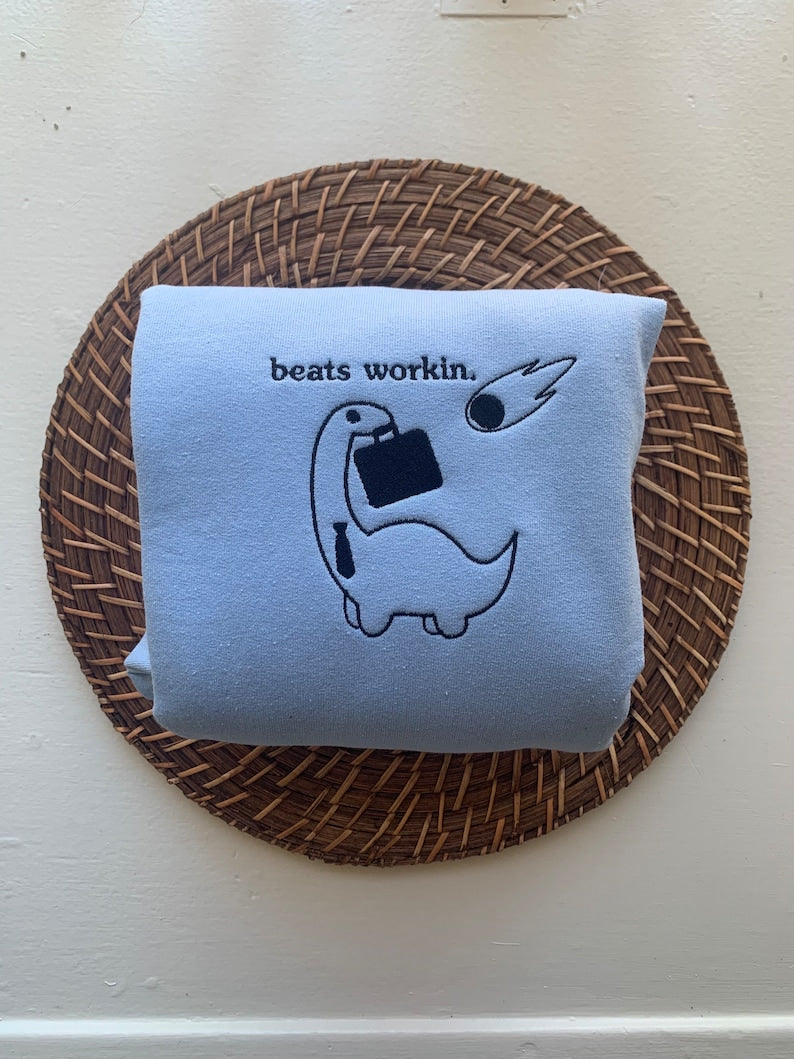 Our "Beats Workin" Embroidered Sweatshirt features a simple, adorable dinosaur—complete with a tie and briefcase—headed to work as a meteor plummets from the sky. It’s the perfect mix of minimalist art, prehistoric panic, and workplace dread. A funny, relatable piece for anyone who's ever looked at their calendar and thought, “Honestly, extinction doesn’t sound that bad today.”